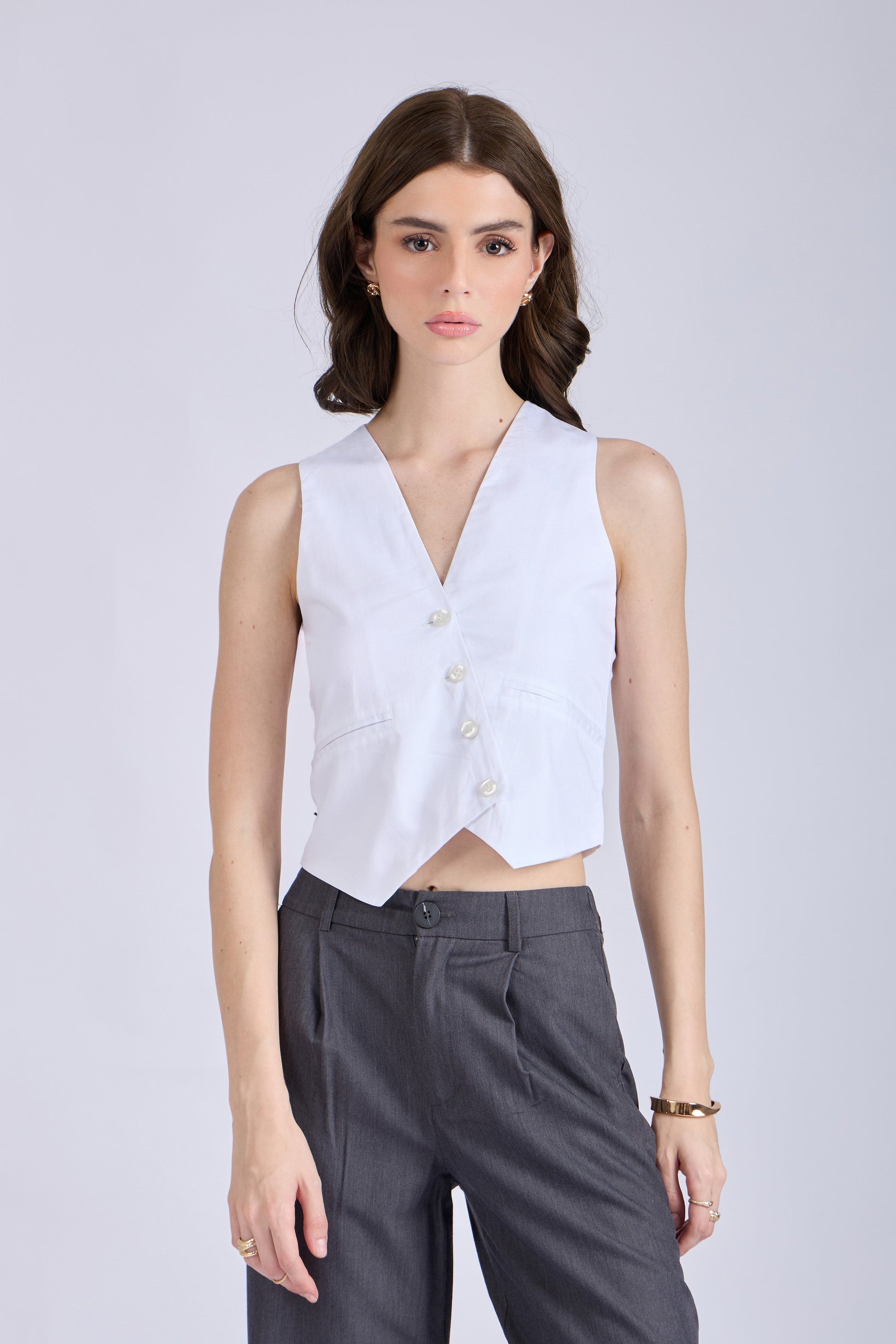 A wardrobe essential with a twist—CLAY is our white asymmetrical waistcoat that redefines structured chic. Crafted in breathable 100% cotton and fully lined, it delivers an airy feel without compromising on polish. The slanting front adds a modern, architectural edge while the same-toned smart buttons blend seamlessly into the minimal silhouette. Designed for power dressing and elevated basics, this piece is perfect for desk-to-dinner looks. Think crisp tailoring, minus the bulk. A true statement staple for any capsule wardrobe.