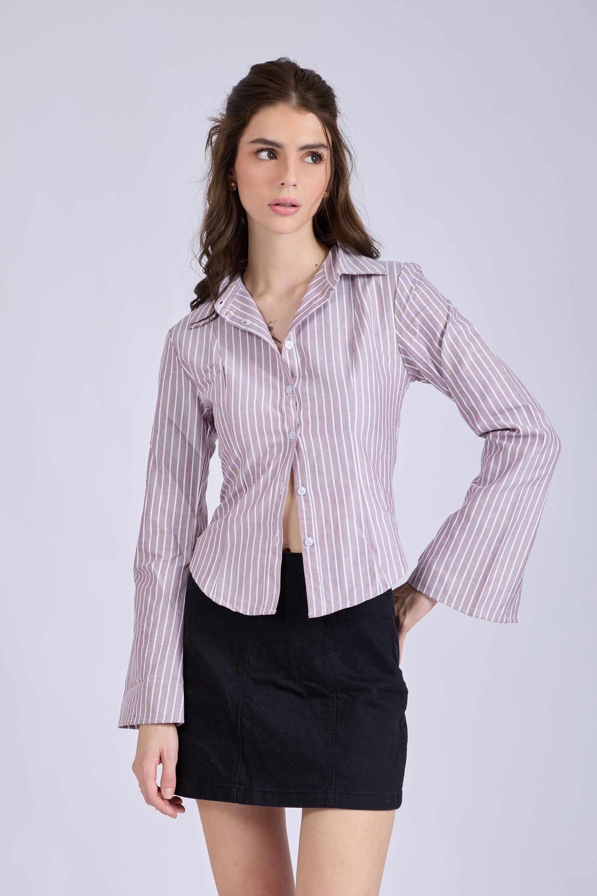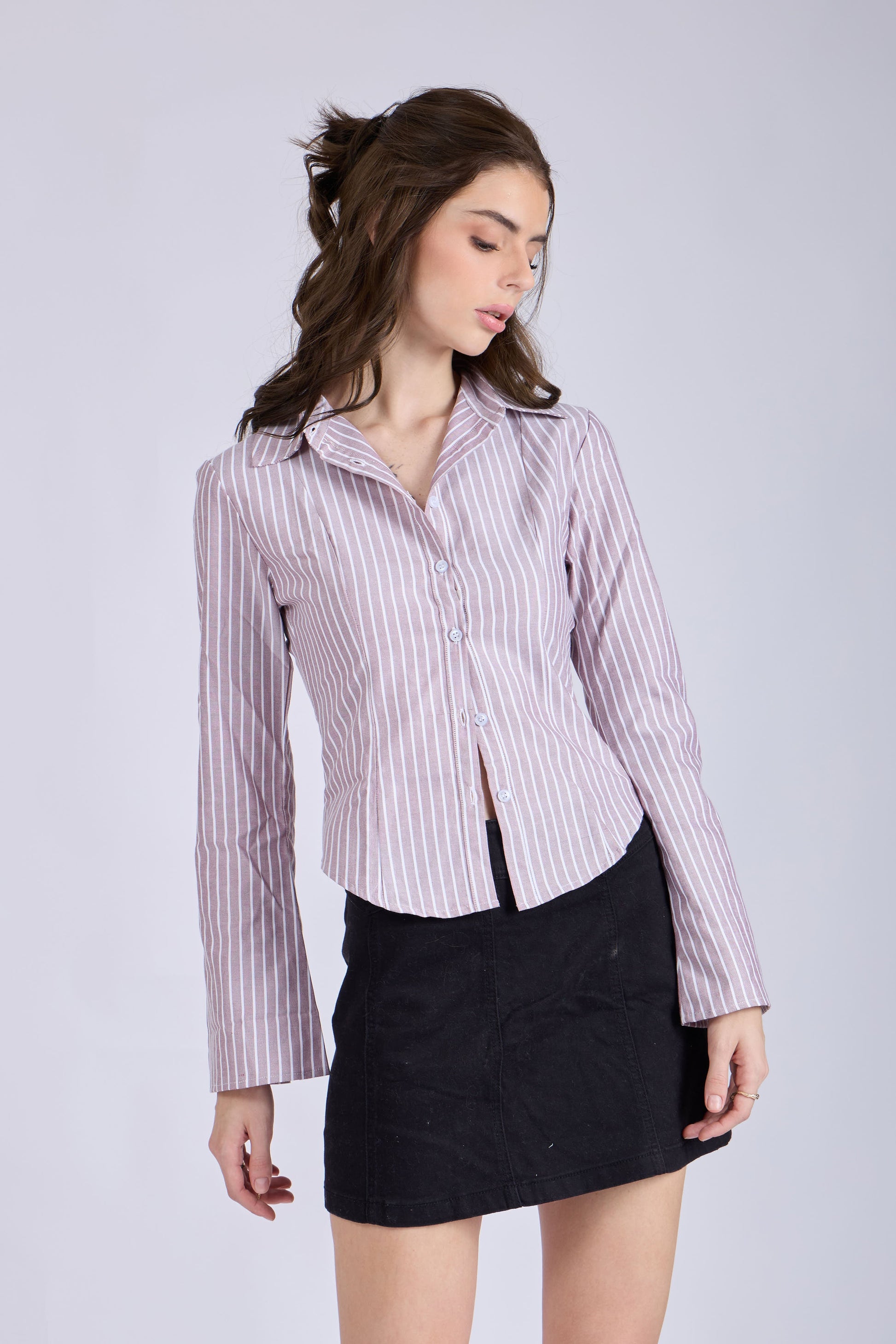 IRIS is your classic fitted shirt with a Gen Z upgrade. Designed to hug your curves just right, the vertical stripes elongate the body and add polish. Cute bell sleeves add a touch of softness to the tailored silhouette, while the neckline is perfect worn slightly unbuttoned for that effortless, undone chic look. The fabric is crisp yet comfy—ideal for layering or wearing solo. Think Parisian cool meets sharp tailoring.
