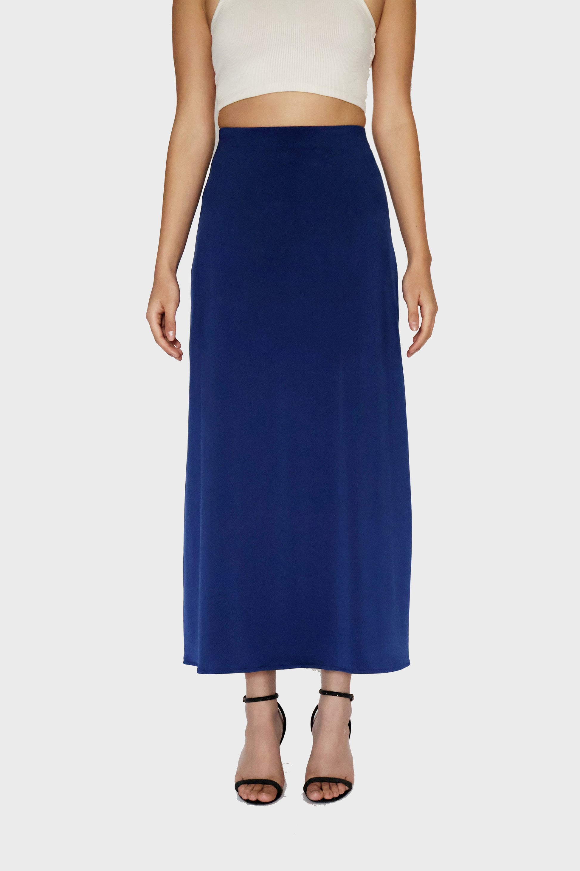 Make a statement with the Cedar Skirt in Navy. This flowy maxi skirt in classic navy blue features a flattering high waist and effortless drape, making it the perfect piece for easy, elevated styling. Pair it with a tucked-in tee or a sleek crop top for day-to-night chic.