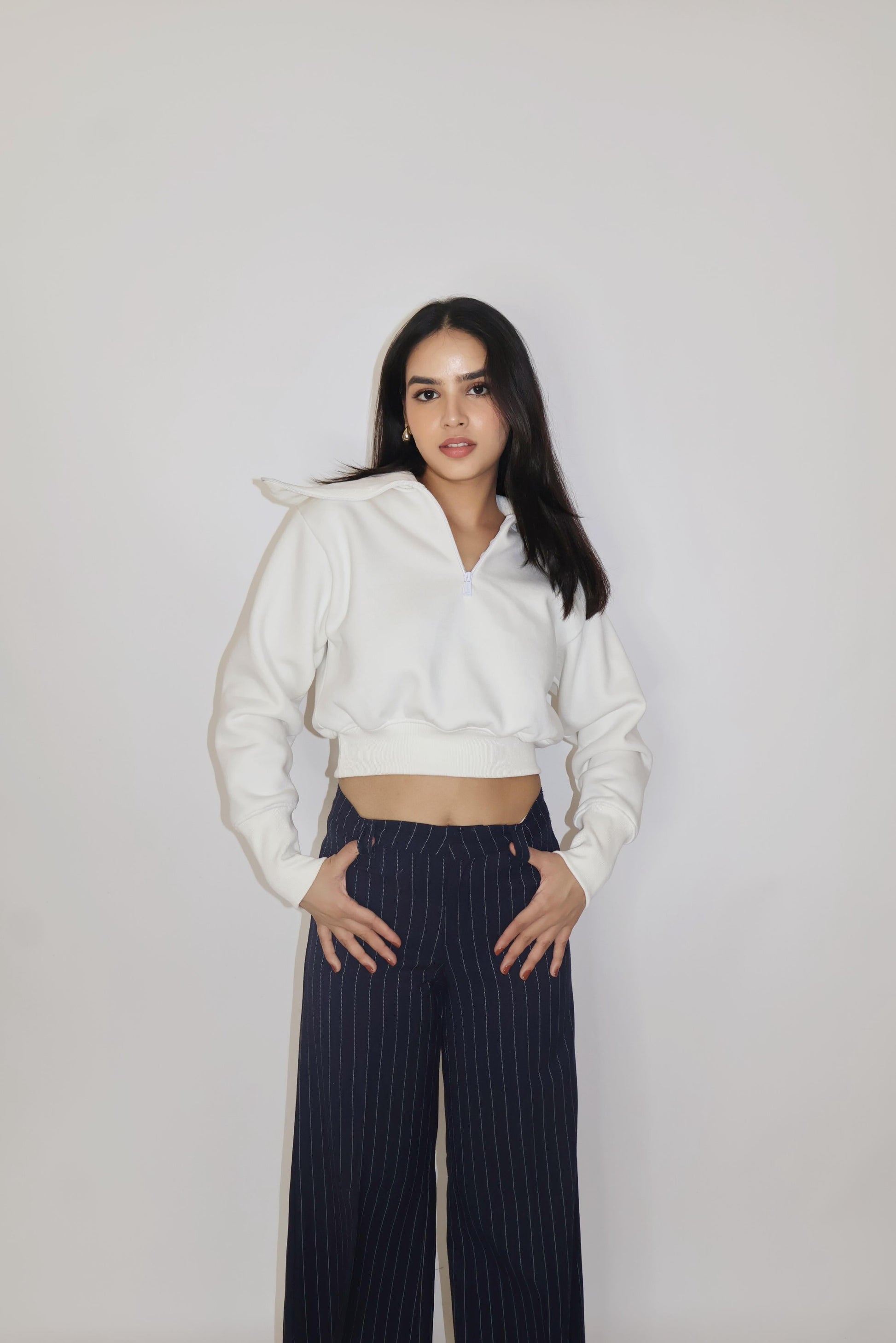 Add an edge to your edits with the Cropped Zipper in Dove. This fitted full sleeve cropped top in serene dove white features a sleek front zipper and structured collar, giving your look a sporty, elevated finish. Pair it with denim, cargos, or matching coords for effortless street style.