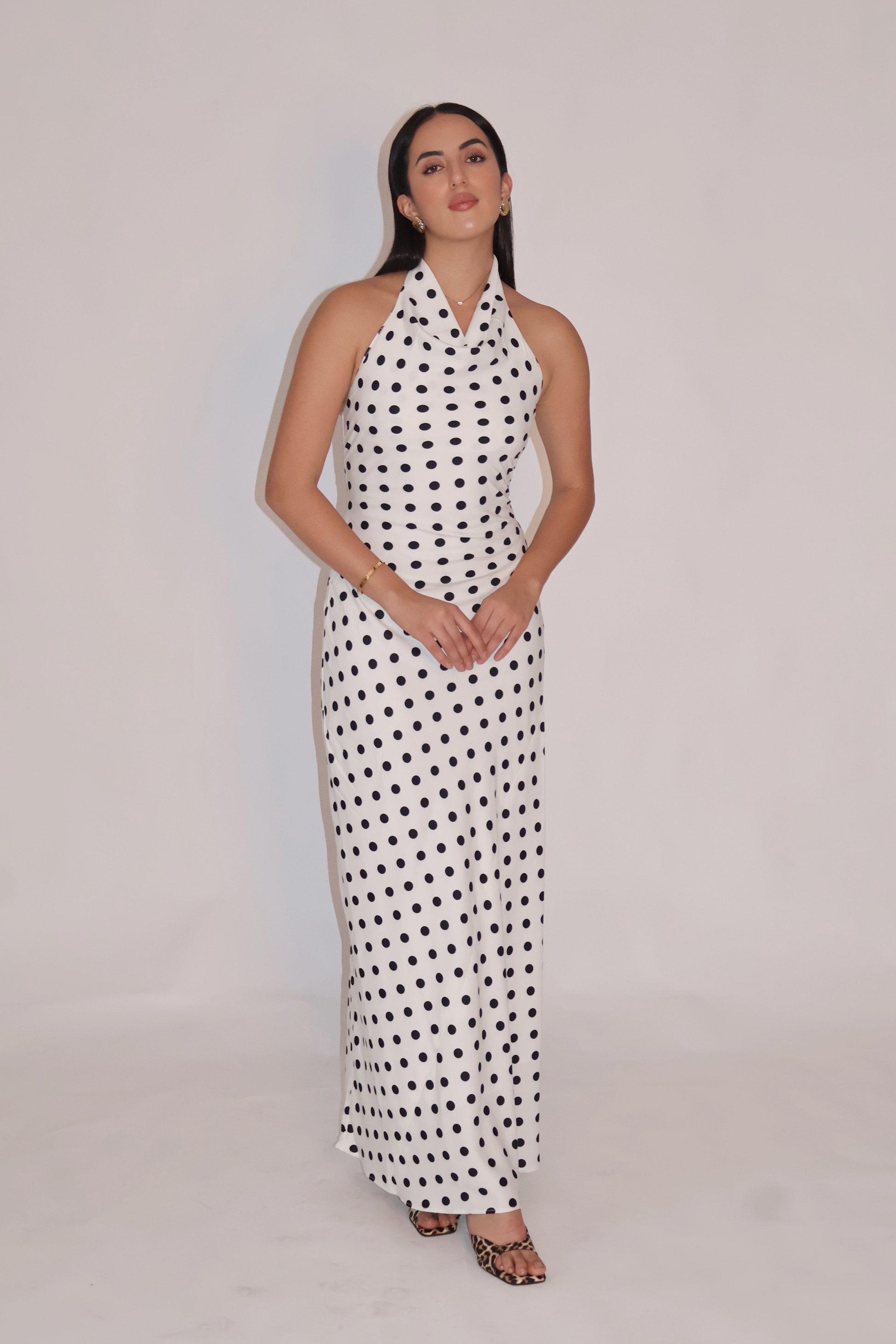 The LYNA Dress is a striking maxi designed with a graceful cowl neckline that frames the shoulders elegantly. Backless with button detailing at the neck and a concealed side zipper, it skims the waist before flaring softly at the hem to enhance natural curves and create a feminine silhouette. Fully lined and crafted from imported georgette crepe, this piece exudes timeless sophistication. Perfect for evening occasions or destination soirées. The model is wearing size S. Delivery within 3–15 business days.