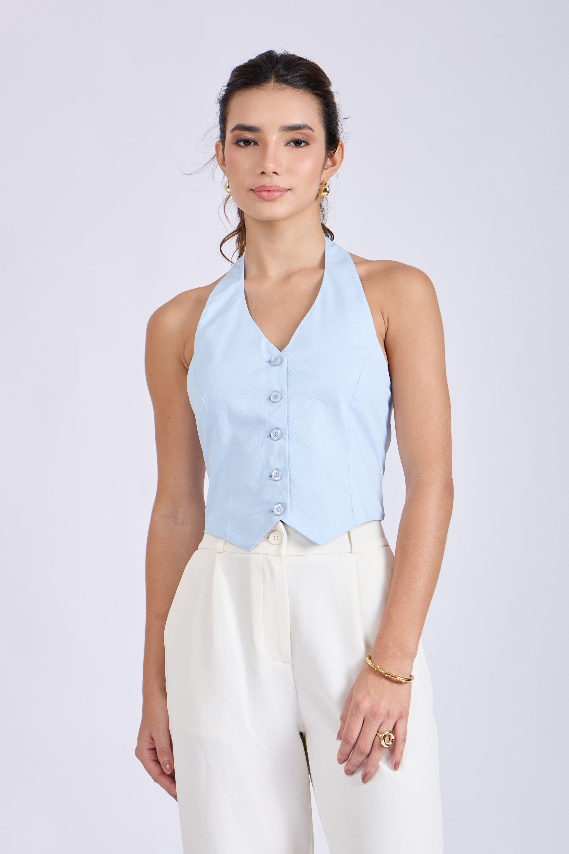 Effortlessly stylish, ELAN is a halterneck waistcoat designed to turn heads. The silhouette flatters your frame with just the right hint of skin, while the structured cotton and inner lining ensure a crisp, tailored feel. The neckline fastens at the back for a clean finish, while sleek buttons down the front add a polished touch. Equal parts sexy and sophisticated, this one is perfect for evening brunches, cocktails, or layering under blazers. Add this to your going-out closet for instant charm.