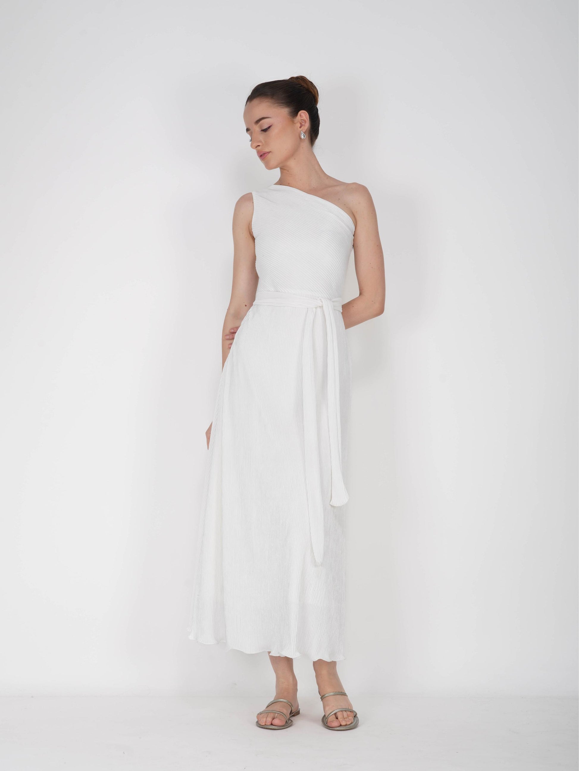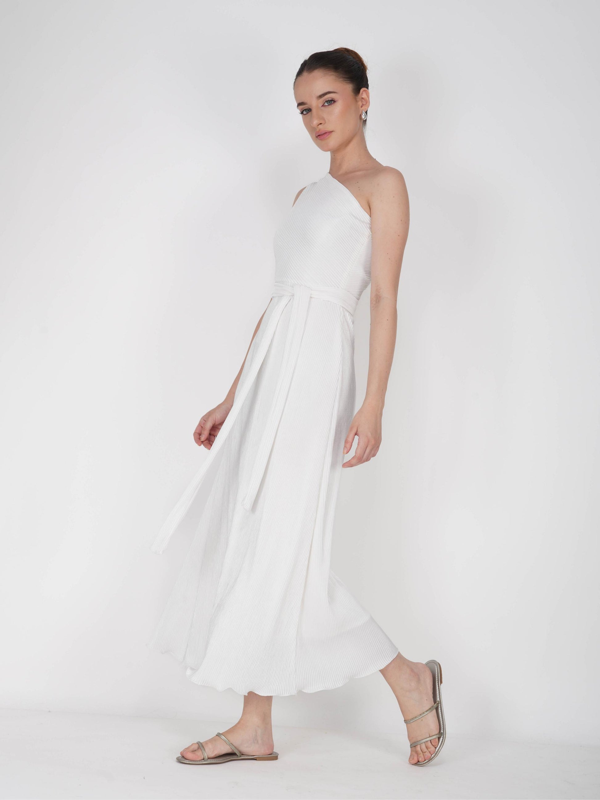 Glow in elegance with the Sun Dress in Dove. This one-shoulder midi dress in crisp dove white features a sleek side zipper and an attached belt to cinch the waist, creating a flattering and feminine silhouette. Perfect for garden parties, brunches, or stylish evenings out.