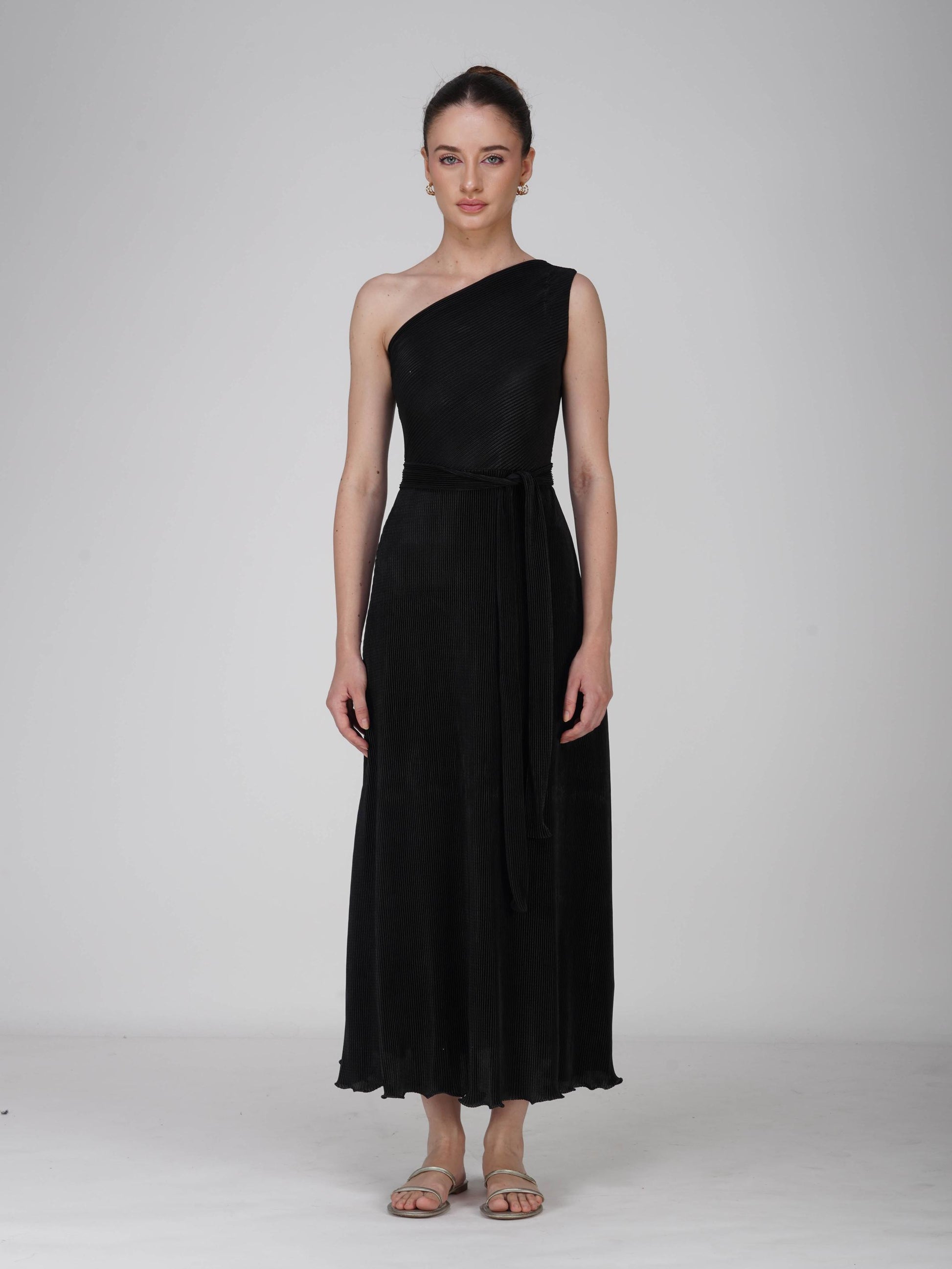 Glow in elegance with the Sun Dress in Onyx. This one-shoulder midi dress in timeless onyx black features a sleek side zipper and an attached belt to cinch the waist, creating a flattering and feminine silhouette. Perfect for garden parties, brunches, or stylish evenings out.